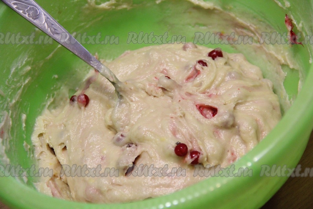 В процессе перемешивания из ягод выделится немного жидкости и тесто станет более нежным и гладким.