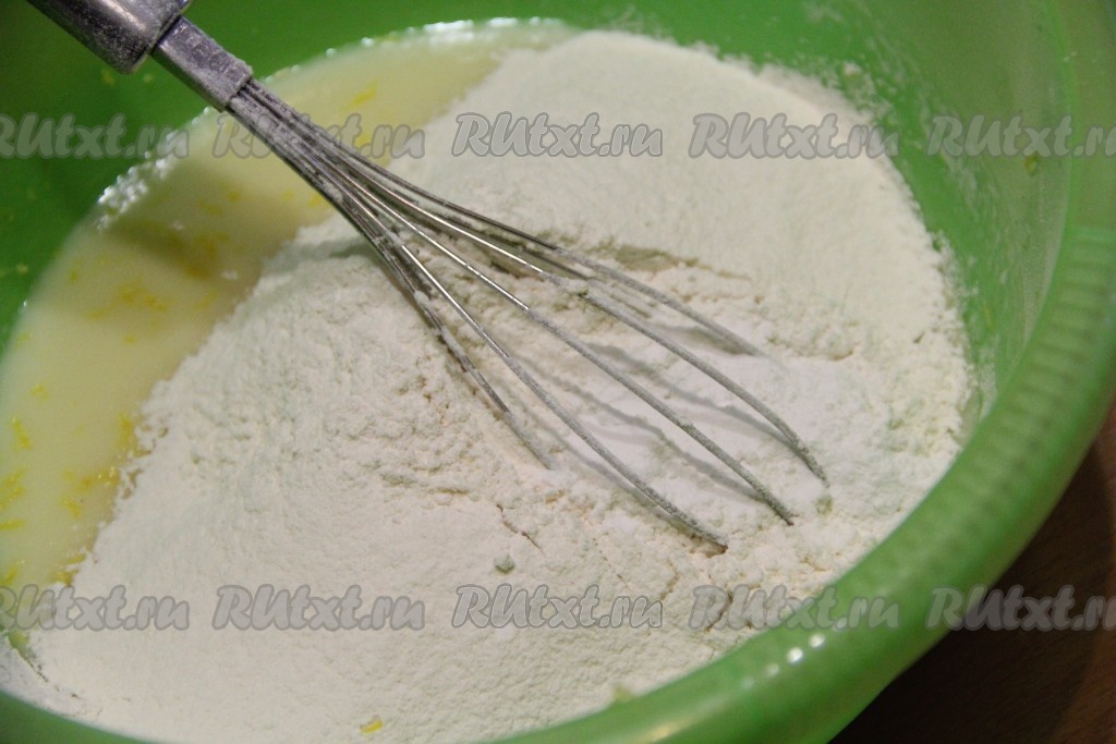 Тщательно перемешать венчиком. Далее всыпать разрыхлитель, частями начать добавлять муку, перемешивая тесто вначале венчиком, а затем - столовой ложкой.