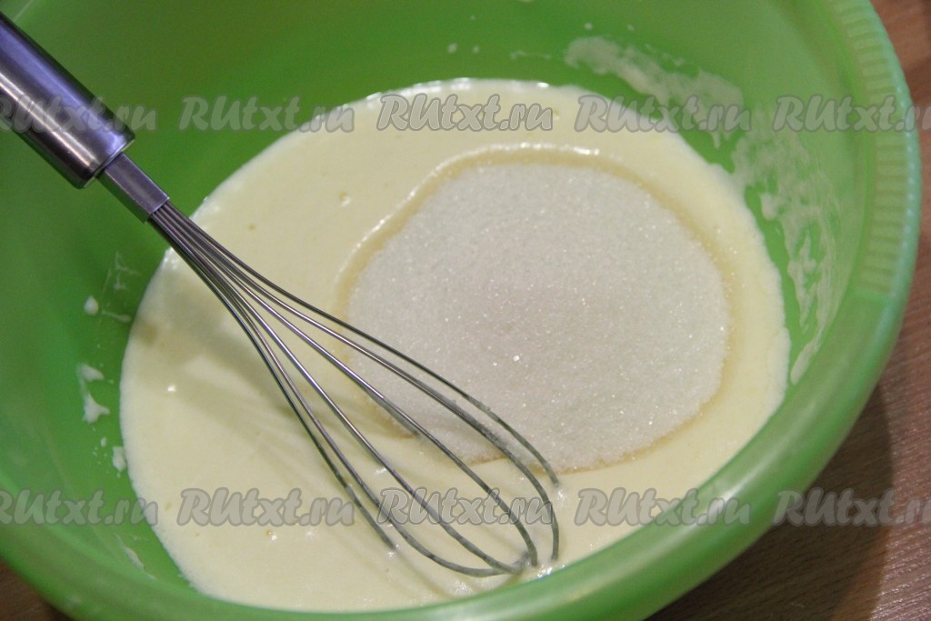 Хорошо перемешать смесь венчиком, после этого всыпать сахар и ванильный сахар.
