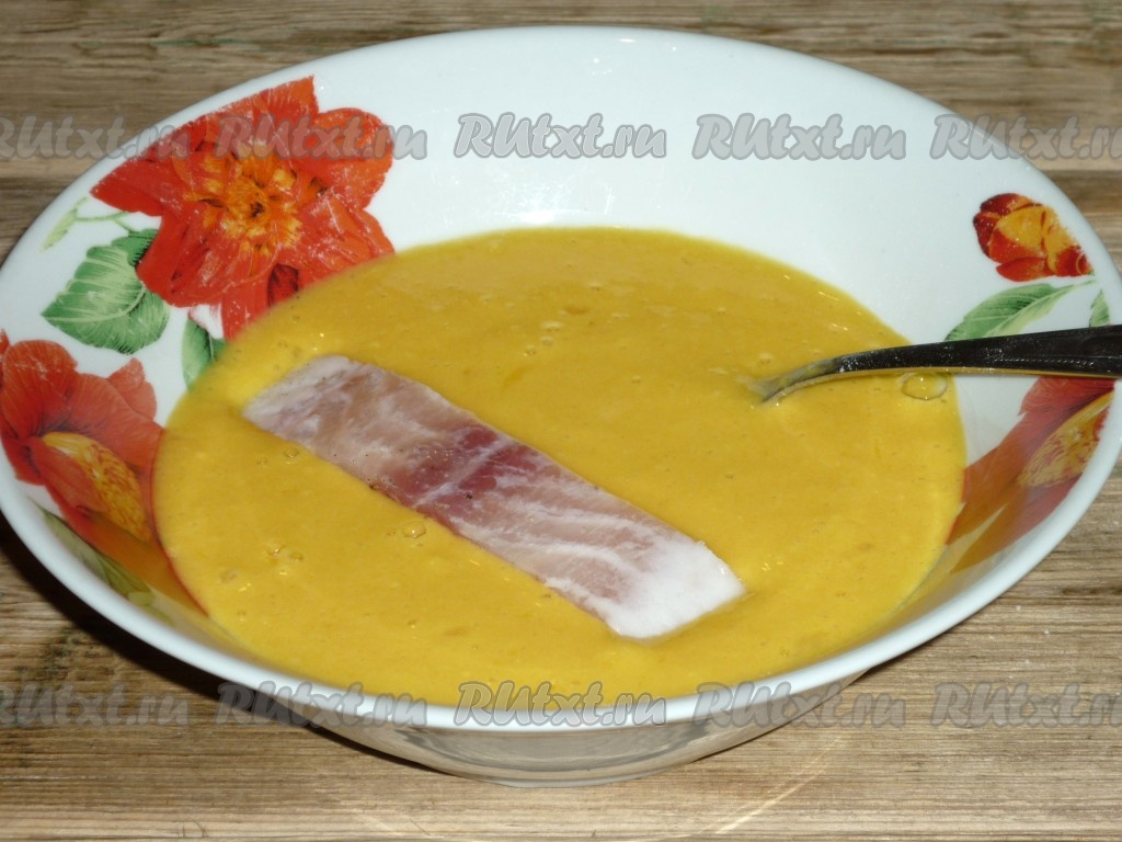 Яйца хорошо взбить вилкой, всыпать щепотку соли. Постепенно добавляя муку, тщательно перемешивать, чтобы в кляре не было комочков. Кляр должен получиться умеренно густым.