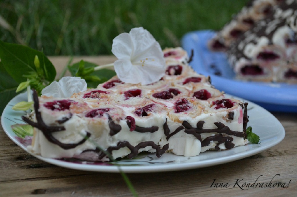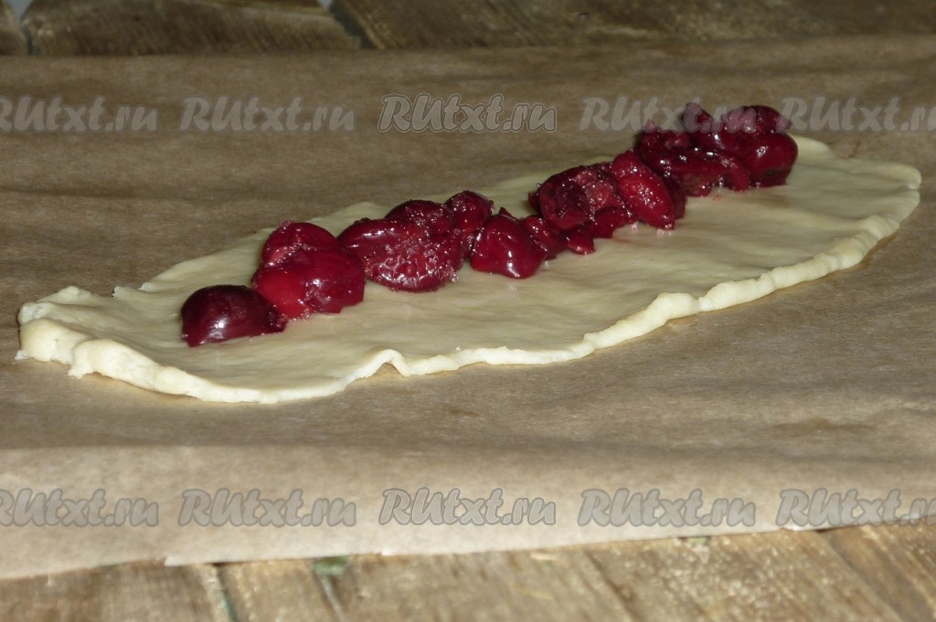 По истечении времени каждую часть теста раскатать в прямоугольник, выложить вишню, аккуратно защипнуть края.