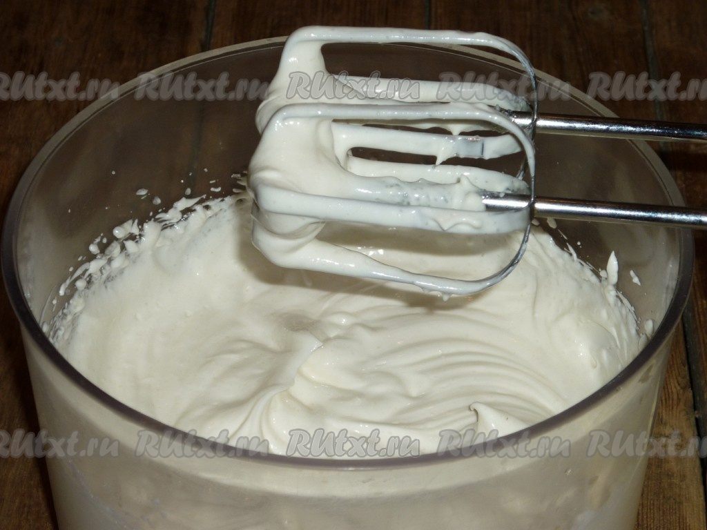 Сметану для приготовления крема нужно отцедить, то есть в марлю, сложенную в несколько раз, выложить сметану. Сметану, завернутую в марлю, поместить в сито. Поставить сито на миску или кастрюлю, чтобы туда сливалась лишняя сыворотка, поверх марли положить небольшой груз и отправить на ночь в холодильник. На следующий день к отцеженной сметане добавить сахар и взбить миксером до получения пышного, густого крема.