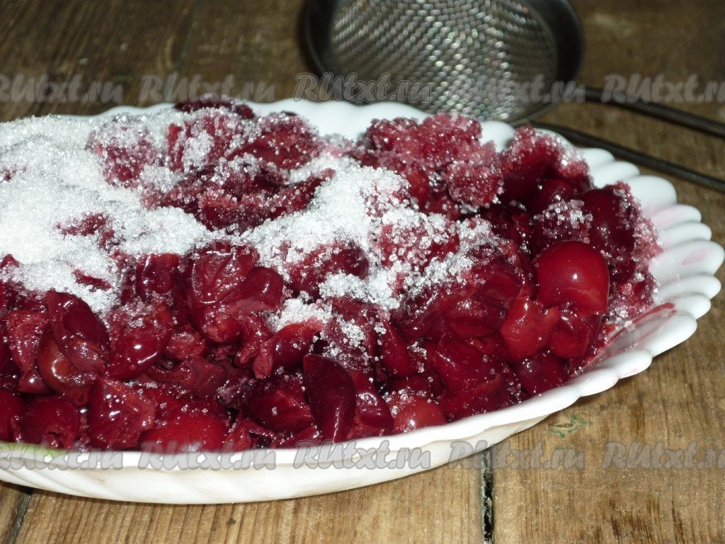 Вишню без косточек засыпать сахаром, оставить на один час, затем выложить в дуршлаг, чтобы стёк лишний вишнёвый сок.