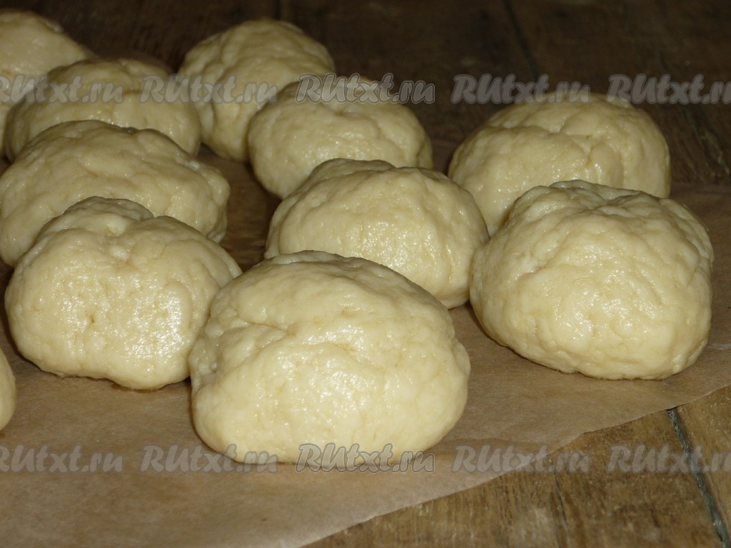 Полученное тесто разделить на 15 одинаковых "шариков" (у меня каждый шарик весил примерно 70 грамм), завернуть их в пищевую пленку и на 2 часа отправить в холодильник.