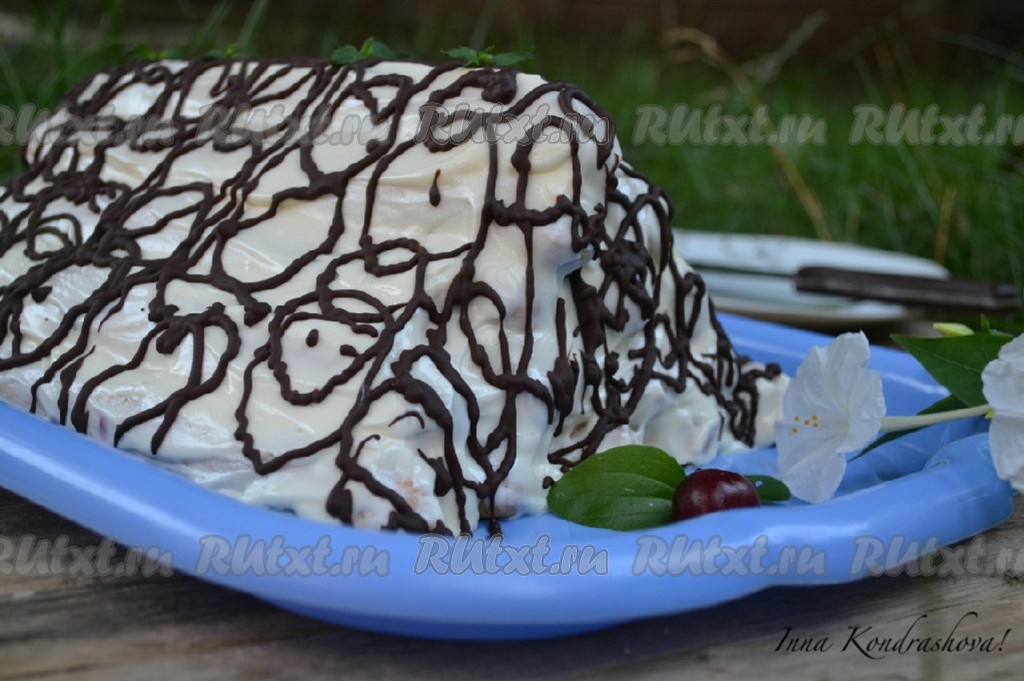 Шоколадом, растопленным на водяной бане, украсить торт.