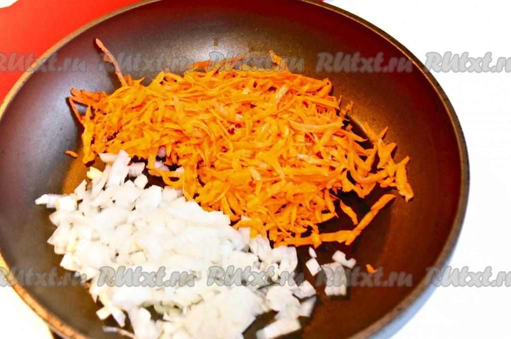 На сковороде разогреть растительное масло, выложить рубленый лук и натертую морковь, обжарить на среднем огне в течение 3 минут, постоянно помешивая.