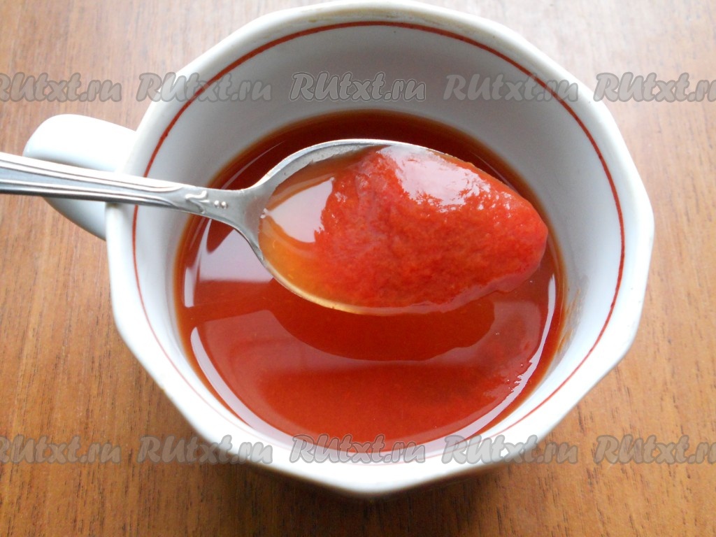 Обжарить лук на среднем огне в течение 3-4 минут до золотистого цвета, периодически помешивая. Томатную пасту развести водой.
