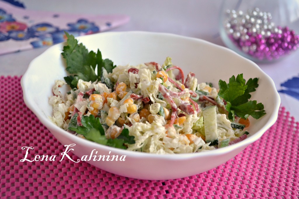 Простой, вкусный салат из пекинской капусты с колбасой и кукурузой сразу же подать к столу.