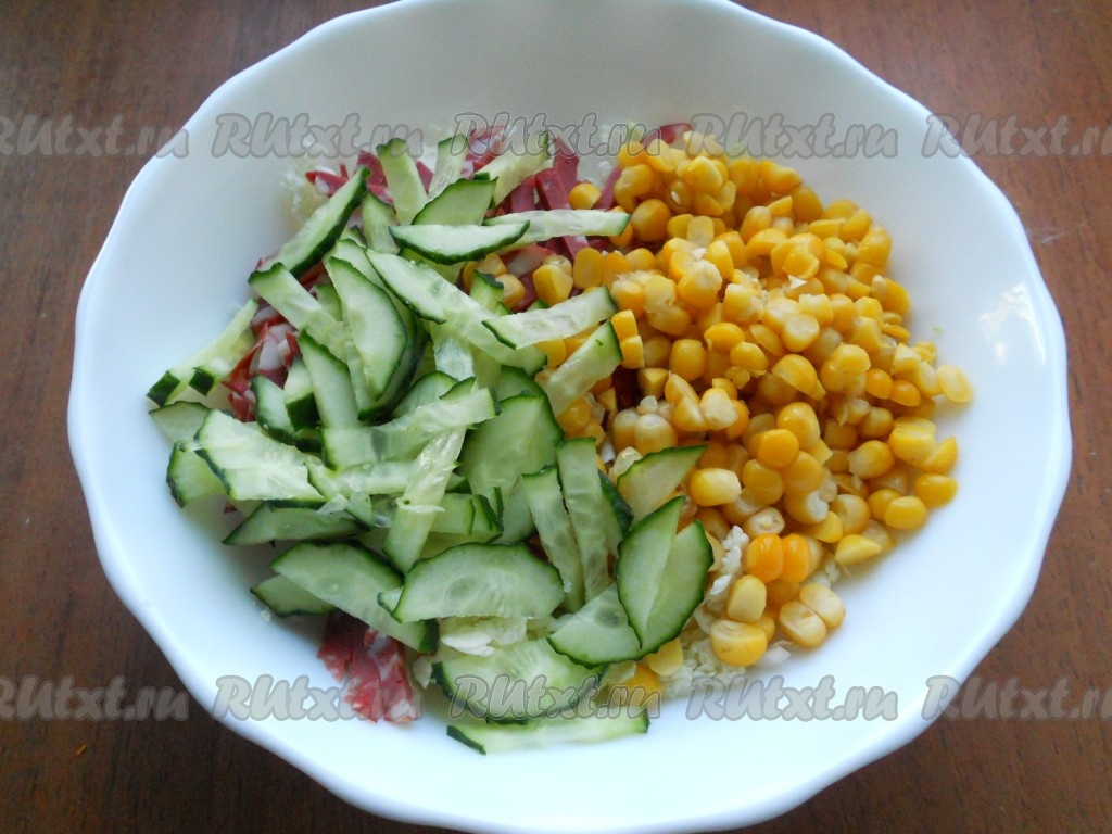Свежий огурчик тоже нарезать тоненькой соломкой и добавить к колбасе и пекинской капусте. В получившийся салат добавить консервированную кукурузу.