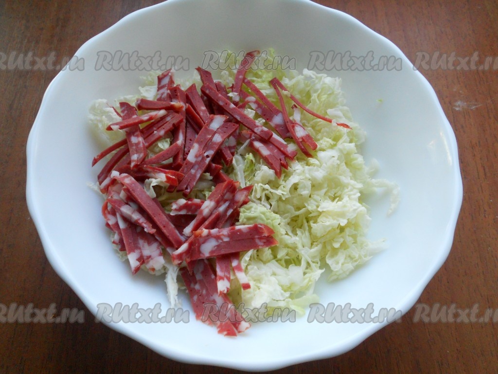 Капусту пекинскую тоненько нарезать, слегка присолить и немного помять рукой. Добавить к капусте копченую колбасу, нарезанную тоненькой соломкой.