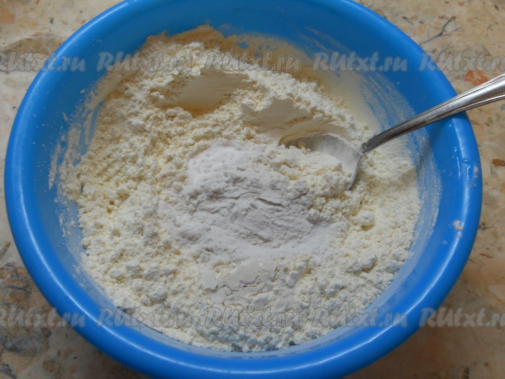 Муку просеять, добавить крахмал, соду и перемешать.