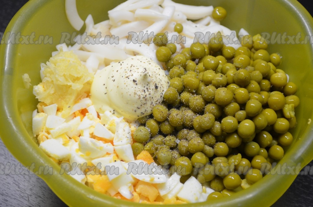 В миску складываем кальмары, яйца, зеленый горошек без жидкости, выдавливаем чеснок, можно, по желанию, добавить немного мелко нарезанного репчатого лука. Солим, перчим, заправляем майонезом.