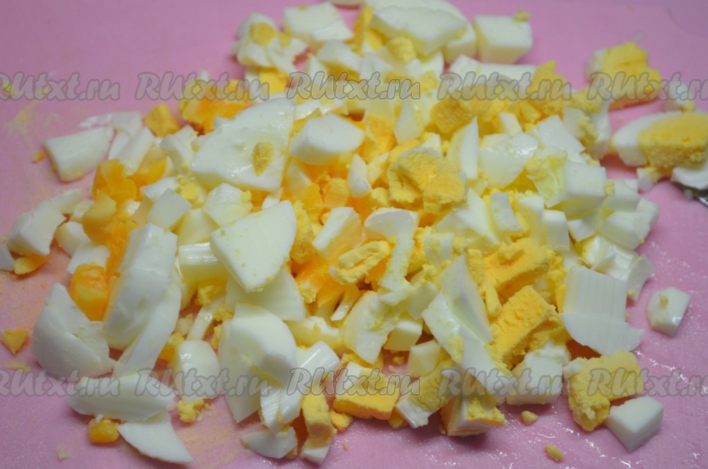Яйца сварить вкрутую (в течение 10 минут с момента закипания воды), затем остудить их, очистить и нарезать кубиками.