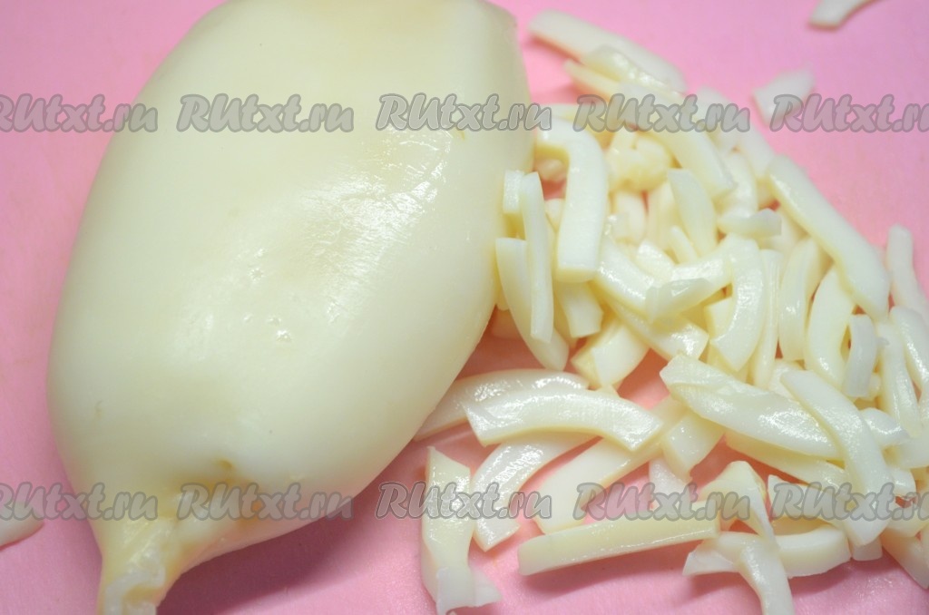 Вскипятить воду. Кальмаров аккуратно опустить в кипящую воду и с момента закипания варить 3 минуты, затем вынуть, остудить, очистить от хорды и плёнок, нарезать мелкой соломкой.