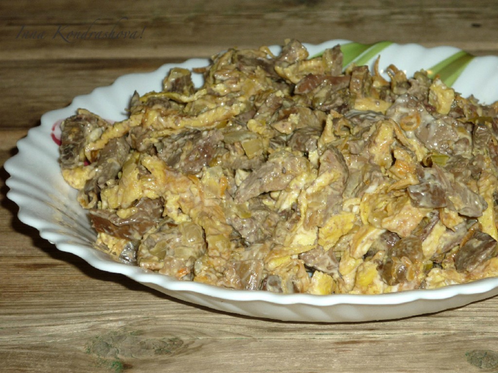 Вкусный, сытный салат с печенью и яичными блинчиками готов. Охладить и можно подавать на стол.