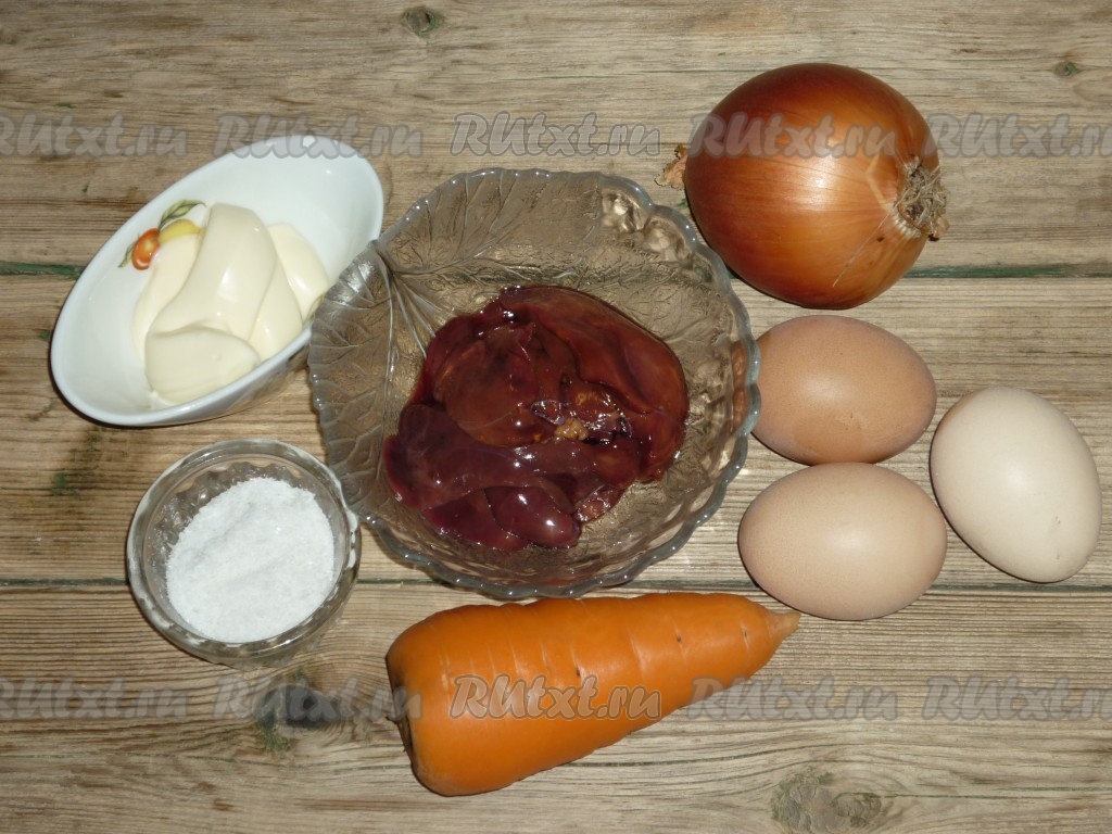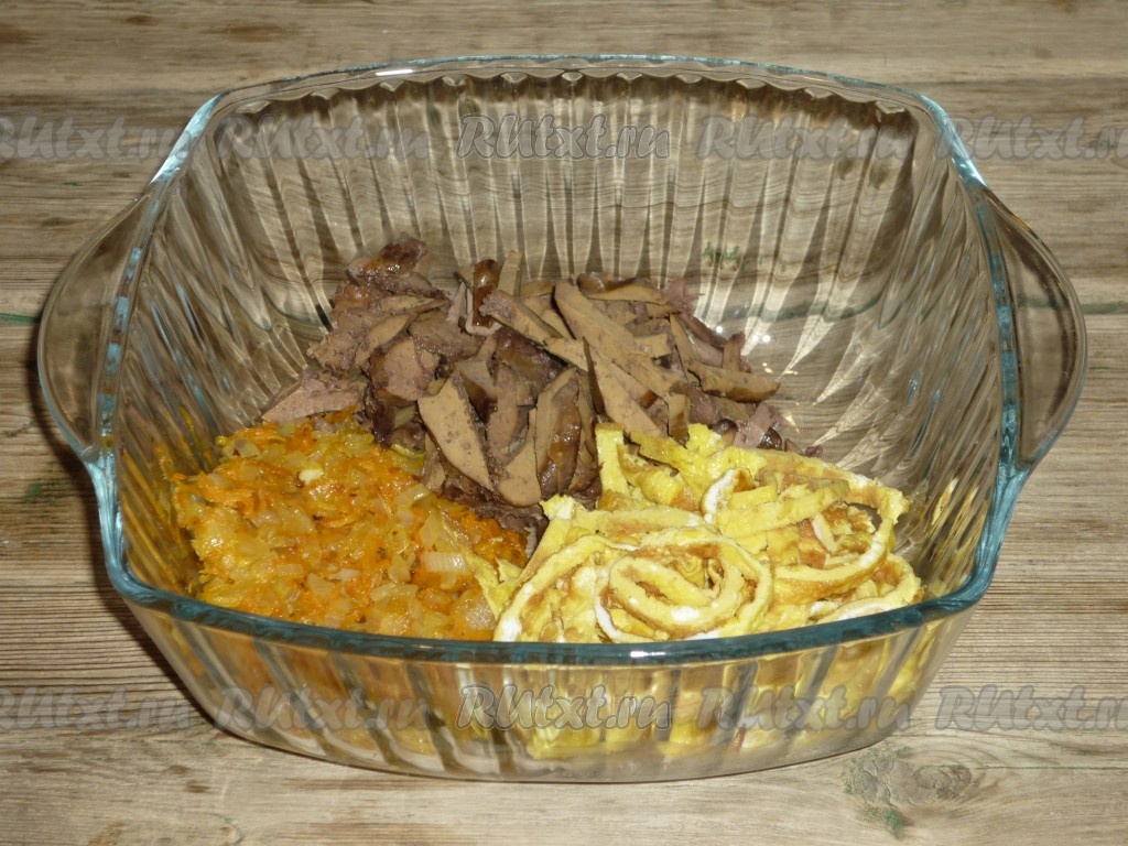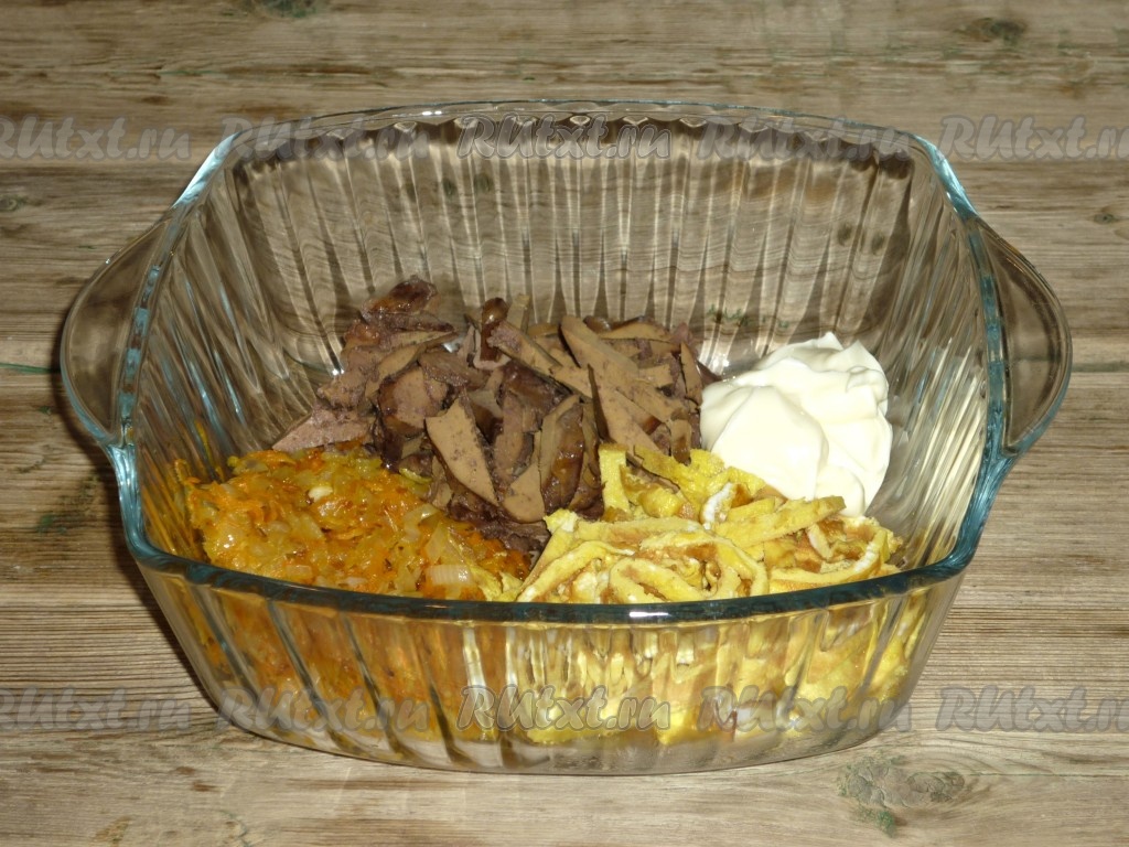 Смешать нарезанные яичные блинчики, обжаренные лук с морковью и печень.