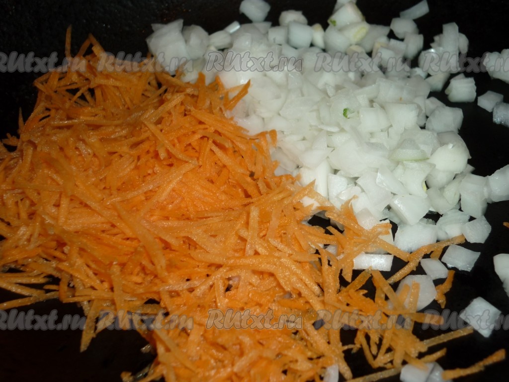 Очистить лук и морковь. Лук нарезать кубиками, морковь натереть на тёрке.