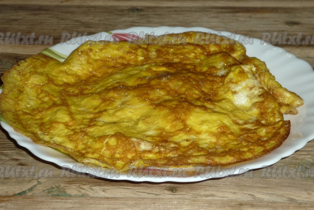 Таким же образом сделать ещё два блинчика из яиц. В результате должно получится три блина. Их нужно сложить в стопку, свернуть рулетом и нарезать полосками шириной в сантиметр.
