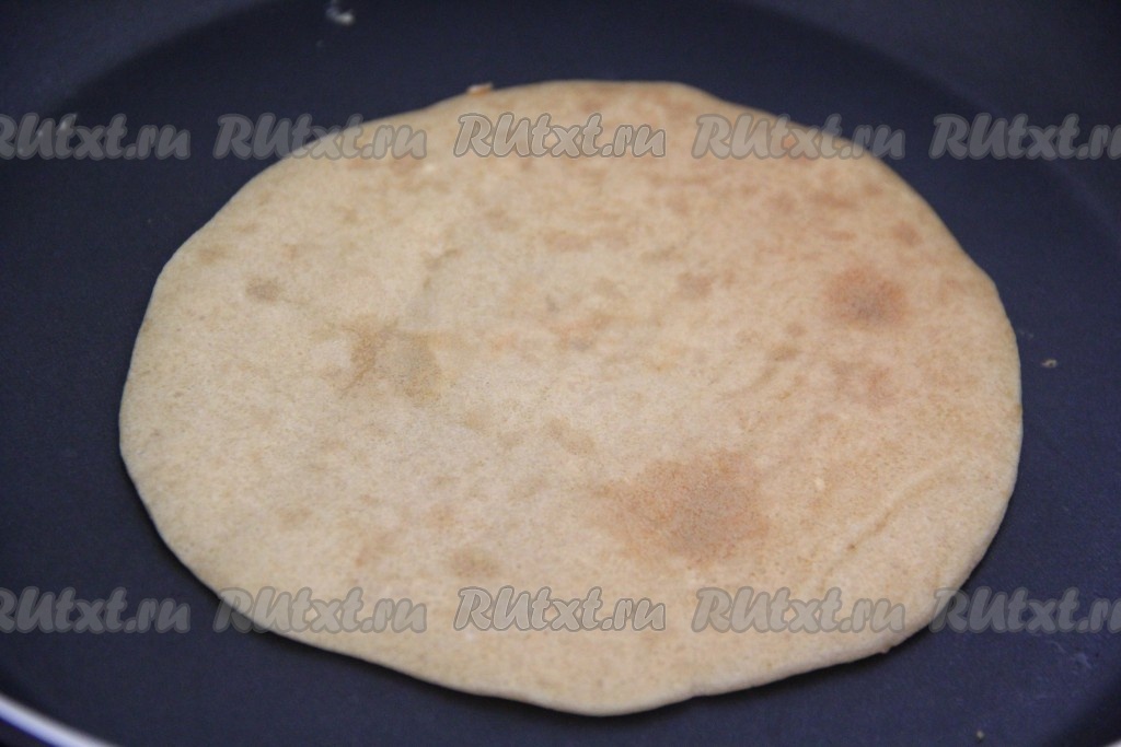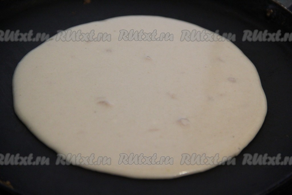 Жарить блин на среднем огне с двух сторон до золотистого цвета, затем переложить на тарелку. Периодически перемешивая тесто, постепенно пожарить все блины.