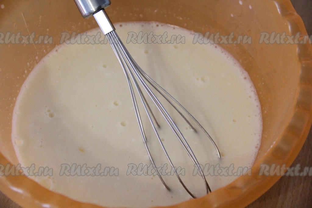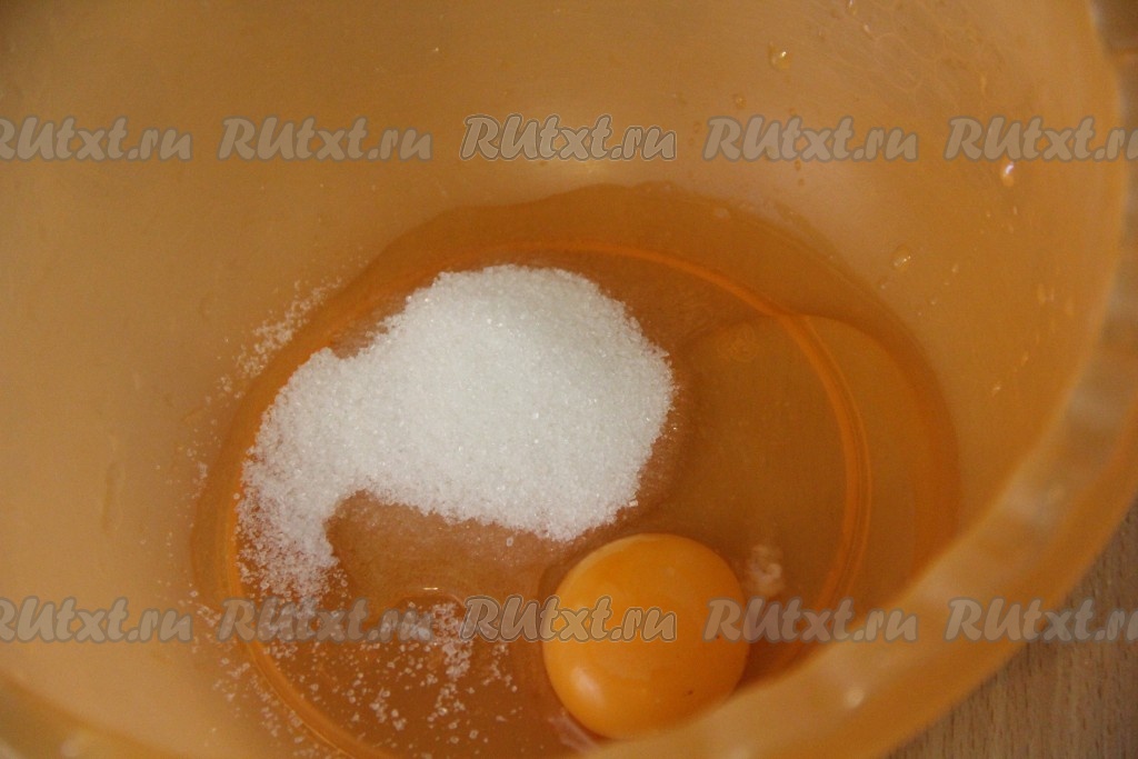 Соединить в объёмной миске яйцо с сахаром, слегка взбить венчиком.
