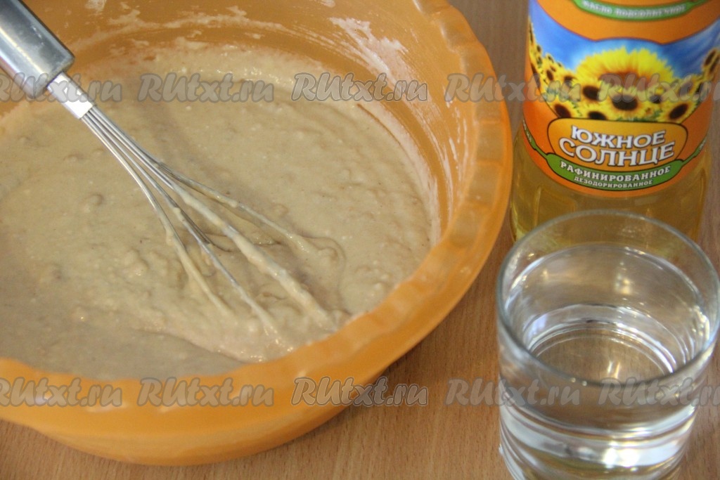 Тщательно перемешать получившееся тесто и оставить на 10-15 минут. Затем тонкой струйкой, постоянно перемешивая венчиком, влить в тесто горячую воду, добавить растительное масло, хорошо перемешать.