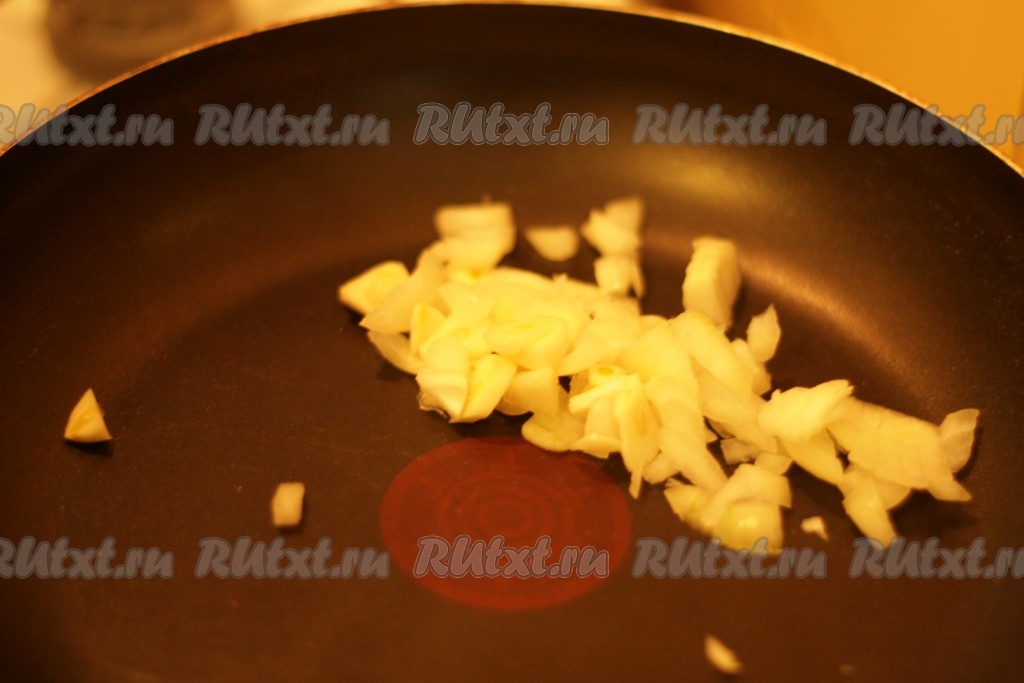 Обжарить лук и чеснок на сухой сковородке в течение 3-4 минут.