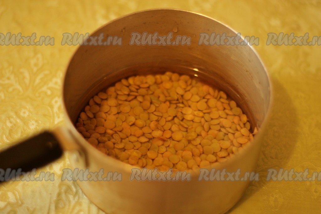 Чечевицу промыть, залить 1,5 стаканами воды.