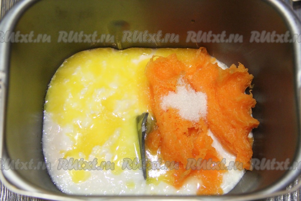 Кефир и мякоть тыквы добавить в ведёрко хлебопечки.