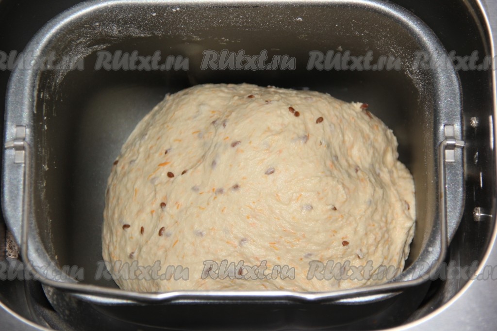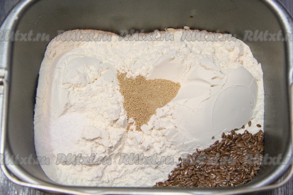 Затем добавить муку, семена льна, соль и дрожжи. Закладку продуктов производить так, как указано в инструкции к Вашей хлебопечке.