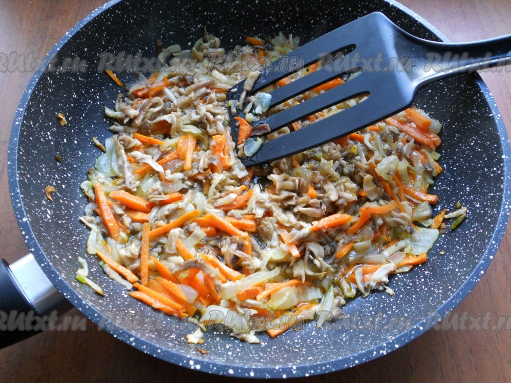 Обжарить лук и морковь до мягкости на среднем огне, периодически помешивая, после чего добавить натёртые грибы, перемешать, обжаривать минуты 3-4, иногда перемешивая.
