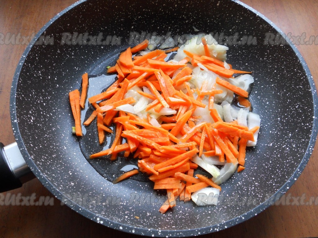 Лук и морковь очистить и нарезать или на кусочки, или на брусочки, или как вам удобно. Поместить овощи в сковороду с растительным маслом.