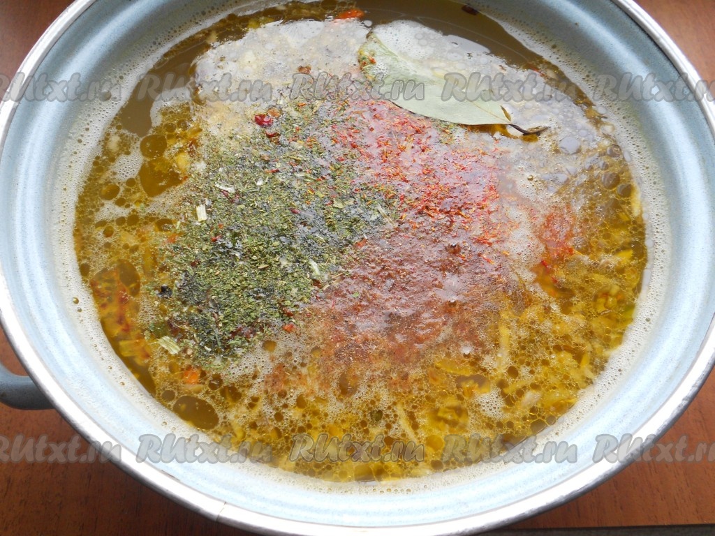 Далее всыпать в суп приправы для супа, добавить лавровый лист и измельчённый чеснок.
