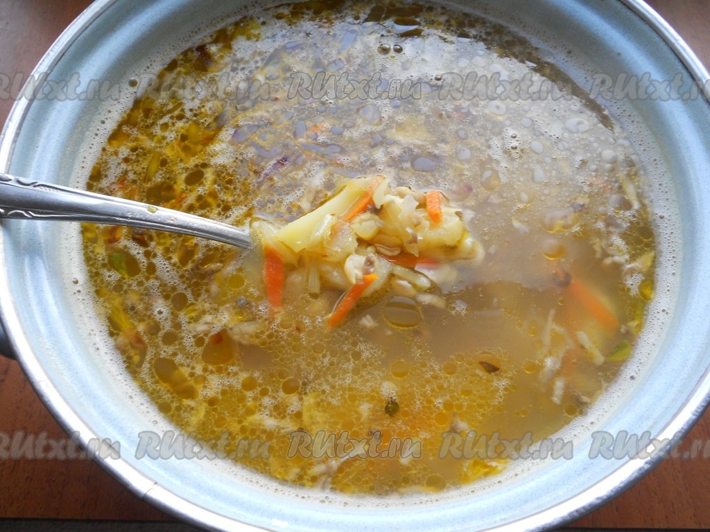 Когда картофель будет готов, добавить в кастрюлю содержимое сковороды, перемешать. Дать постному горохово-грибному супу закипеть, а затем варить его на медленном огне 4-5 минут.