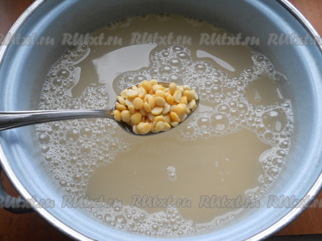 Горох промыть водой. Затем выложить горох в кастрюлю, в которой будете готовить суп, залить 3 литрами холодной воды, оставить на 3-4 часа.