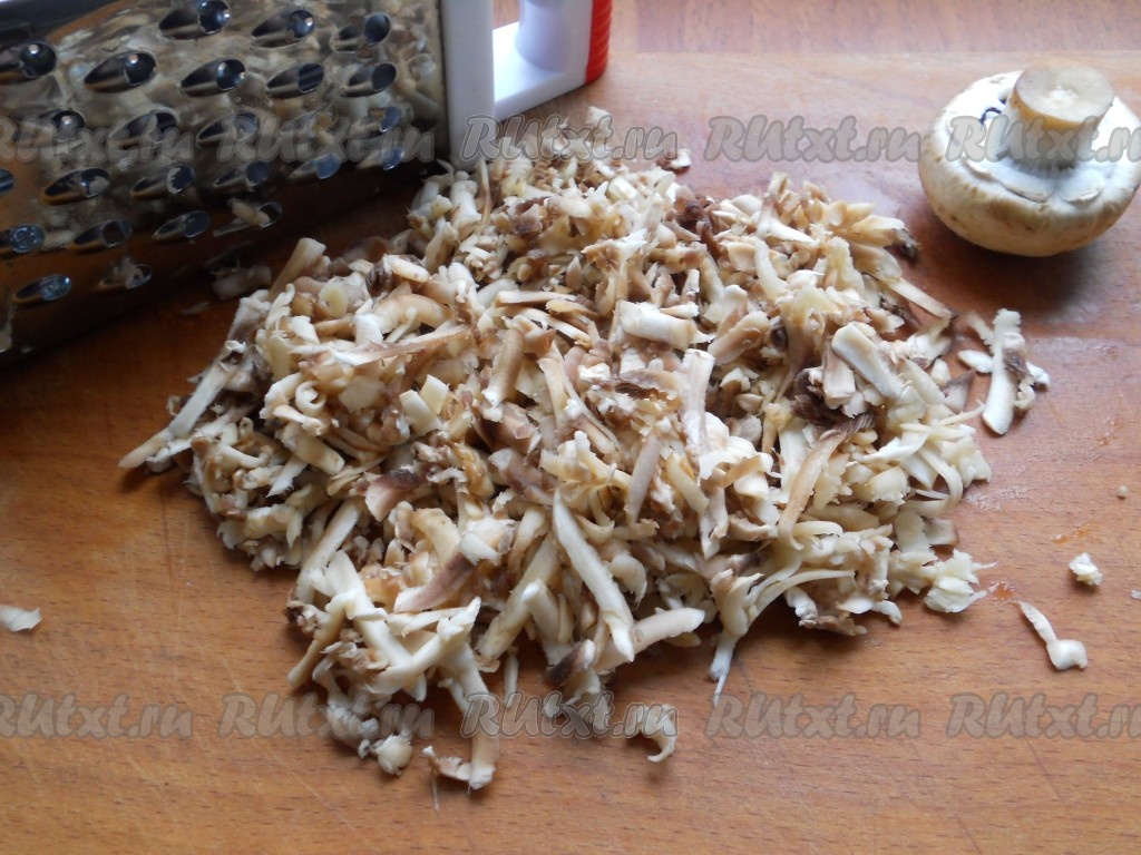 Пока варится картошка, займёмся грибной зажаркой. Для этого шампиньоны нужно вымыть и натереть их на крупной тёрке.