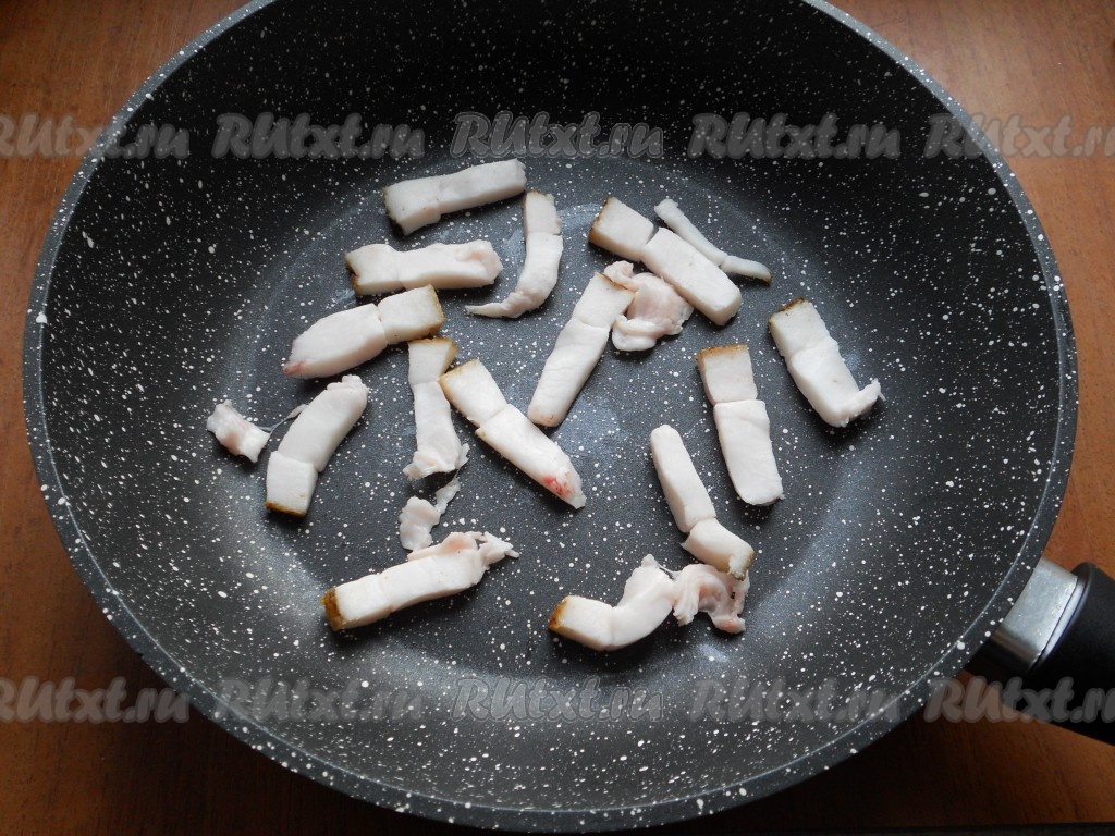 Сало можно использовать как свежее, так и соленое. Если готовите с соленым салом, то блюдо можно не солить. Сало нарезать небольшими брусочками, поместить в сковороду.
