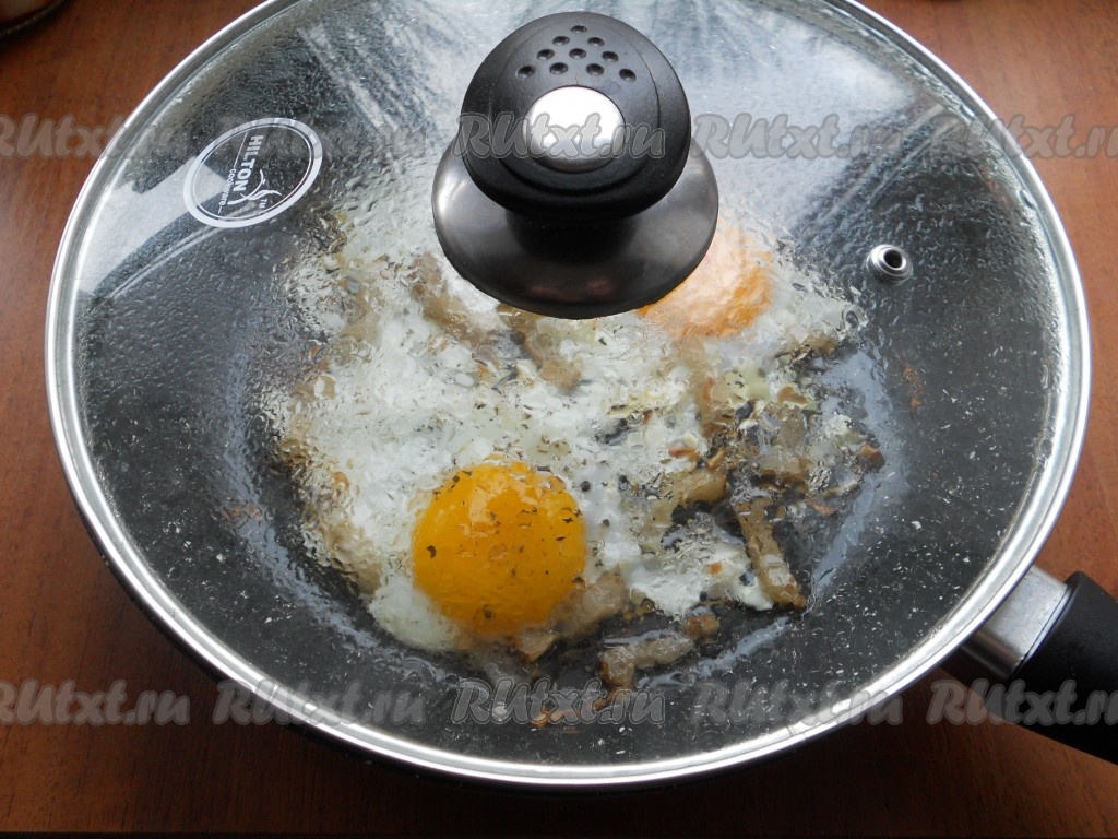 Жарить яйца до тех пор, пока не свернется белок, затем газ выключить и накрыть сковороду крышкой. Оставить яичницу с салом под крышкой на 2-6 минут (время зависит от того, какой консистенции желтки вы любите).