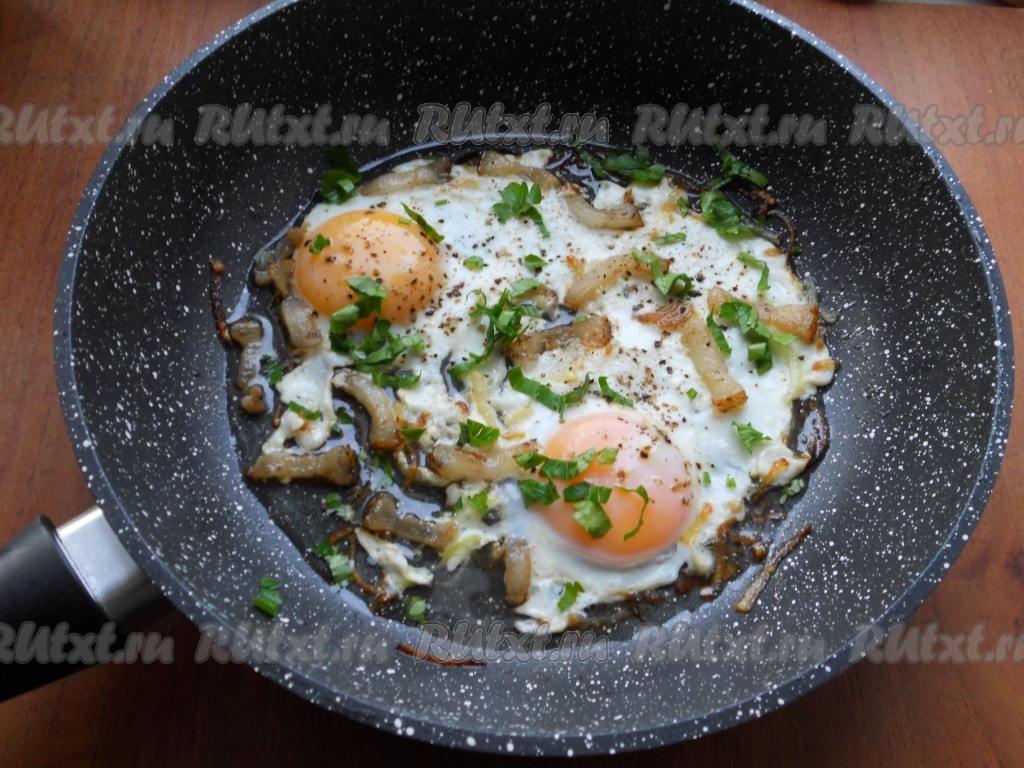 Готовую яичницу посыпать свежей измельченной зеленью.