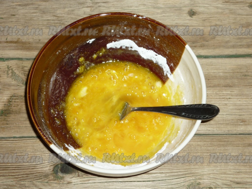 Однородную шоколадную массу снять с водяной бани, дать немного остыть. В отдельной ёмкости взбить яйца с сахарной пудрой венчиком до получения однородной массы.