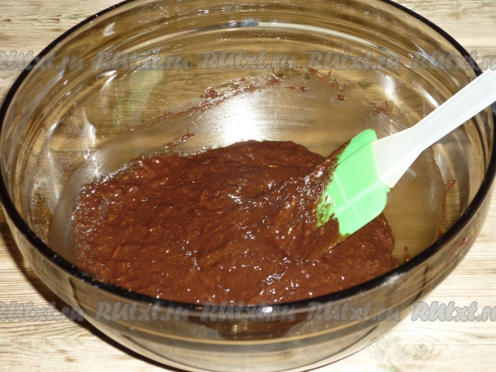 К полученной яичной массе добавить какао, соль, разрыхлитель и муку, перемешать до однородности и соединить с тёплой растопленной шоколадной массой, хорошо перемешать. Тесто для приготовления шоколадного фондана получится достаточно густым.