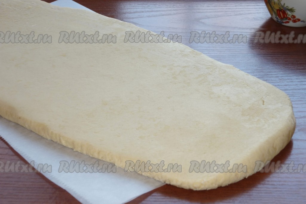 Слоеное тесто раскатать в пласт толщиной примерно 0,5 см.