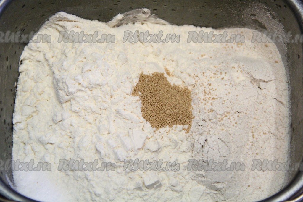 Производить закладку продуктов нужно в соответствии с инструкцией к вашей хлебопечке. Выставить режим выпекания "Основной" или "Белый хлеб", у меня он занимает 3 часа 30 минут. Вес буханки - 1 кг, цвет корочки - "Средний". Контролируйте формирование колобка, если тесто будет липким и вязким, добавьте немного пшеничной муки. Колобок должен быть эластичным и не липнуть к стенкам ведёрка.