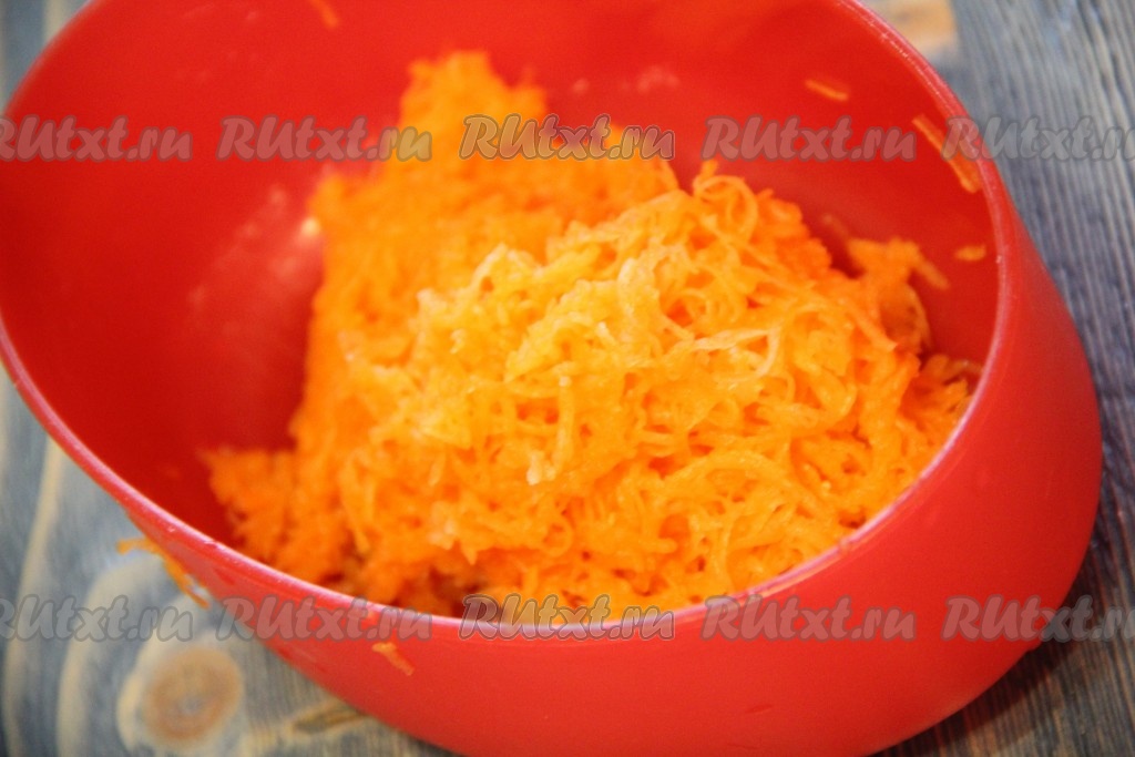 Натереть на мелкой тёрке мякоть тыквы и хорошо отжать сок.