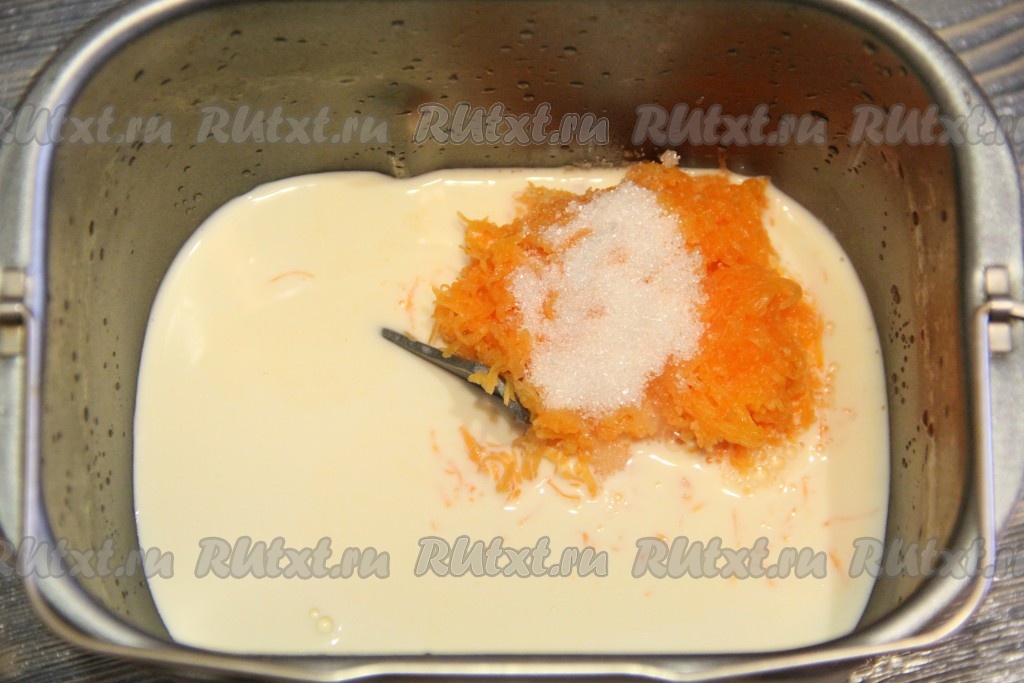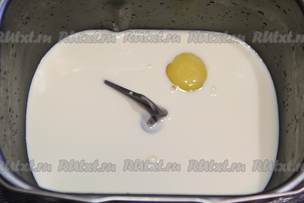 Молоко комнатной температуры, растительное масло и яйцо добавить в ведёрко хлебопечки.