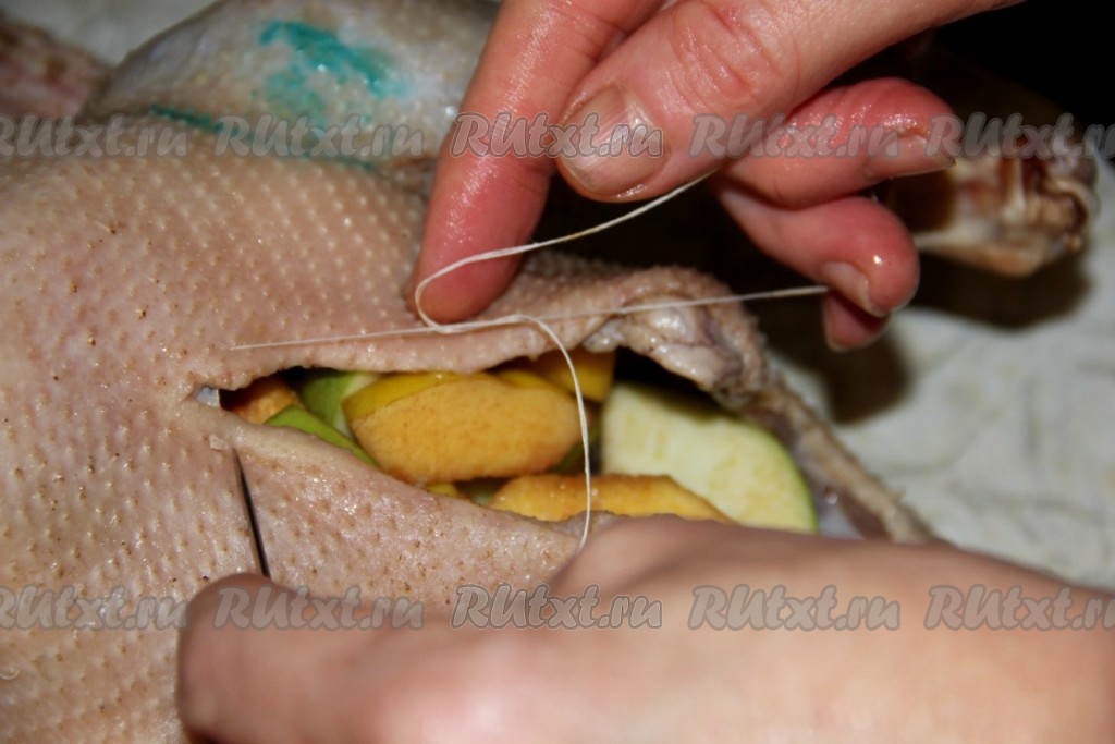 Утку, фаршированную яблоками и айвой, зашиваем обычной ниткой.