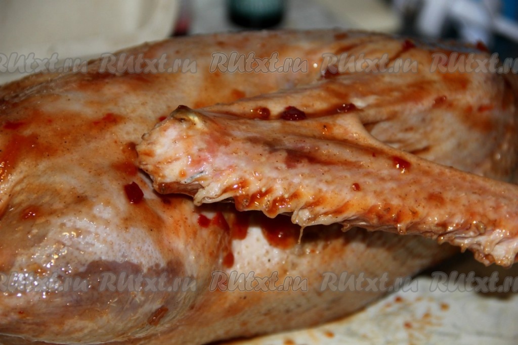 Натираем фаршированную утку получившейся смесью мёда и кетчупа.