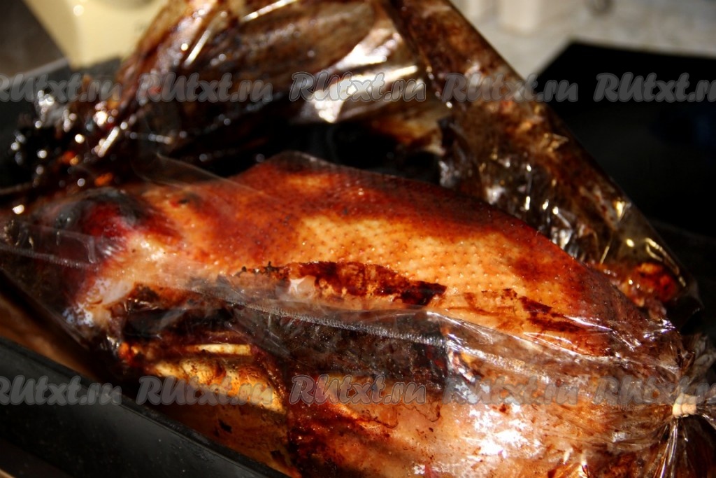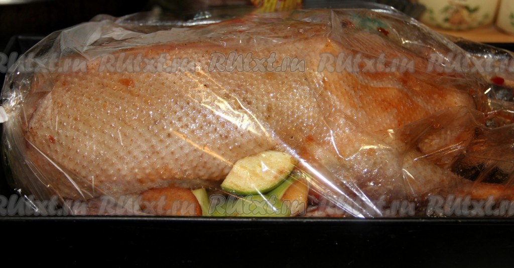 Рукав с уткой, фаршированной яблоками и айвой, перекладываем на противень, отправляем в разогретую духовку и запекаем 2-2,5 часа при температуре 180-200 градусов.