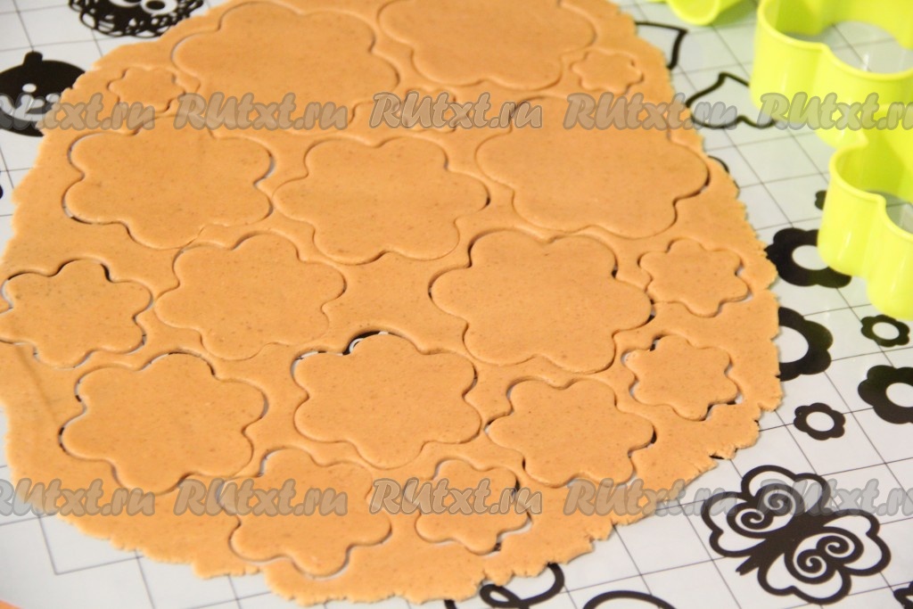 Готовое тесто разделить на 2-3 части. Раскатать тесто скалкой в тонкий пласт и с помощью формочек для вырубки печенья вырезать цветочки или звёздочки разных размеров. Пока раскатываем одну часть теста, остальное тесто лучше убрать в холодильник!