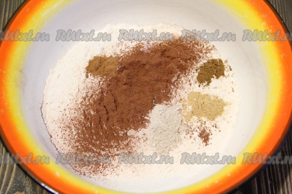 В глубокую миску просеять муку, добавить специи, какао и соду.