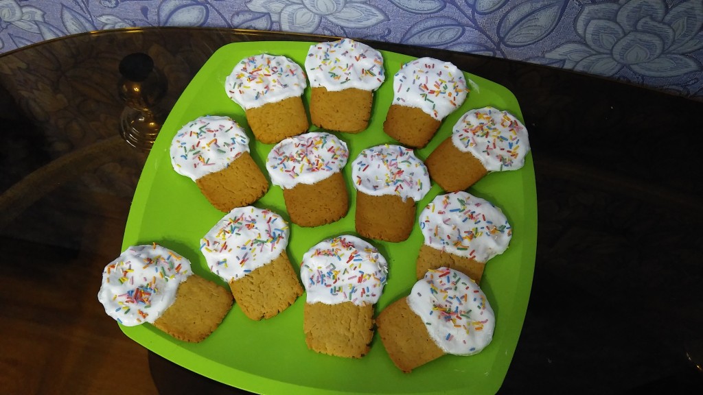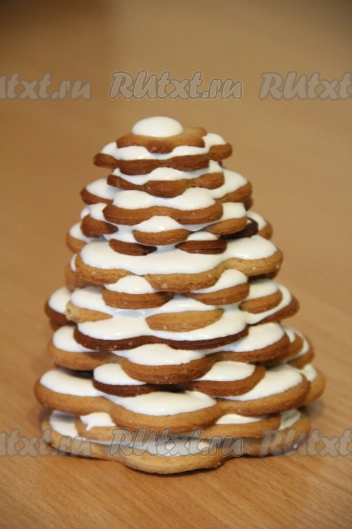 Приготовить глазурь: яичный белок взбить в пышную пену, затем всыпать сахарную пудру и хорошо взбить до белой и гладкой массы. В конце взбивания добавить горячую воду и ещё раз взбить. Глазурь получится гладкой, блестящей и не густой, можно сказать, льющейся. Собрать наши ёлочки: смазать печенье глазурью и выложить друг на друга, слегка прижимая. Глазурь схватится через пару часов. Украсить ёлочки нужно сразу, посыпав их различной посыпкой, чтобы декор закрепился на жидкой глазури. Оставить ёлочки на ночь, для того чтобы они хорошо высохли.
